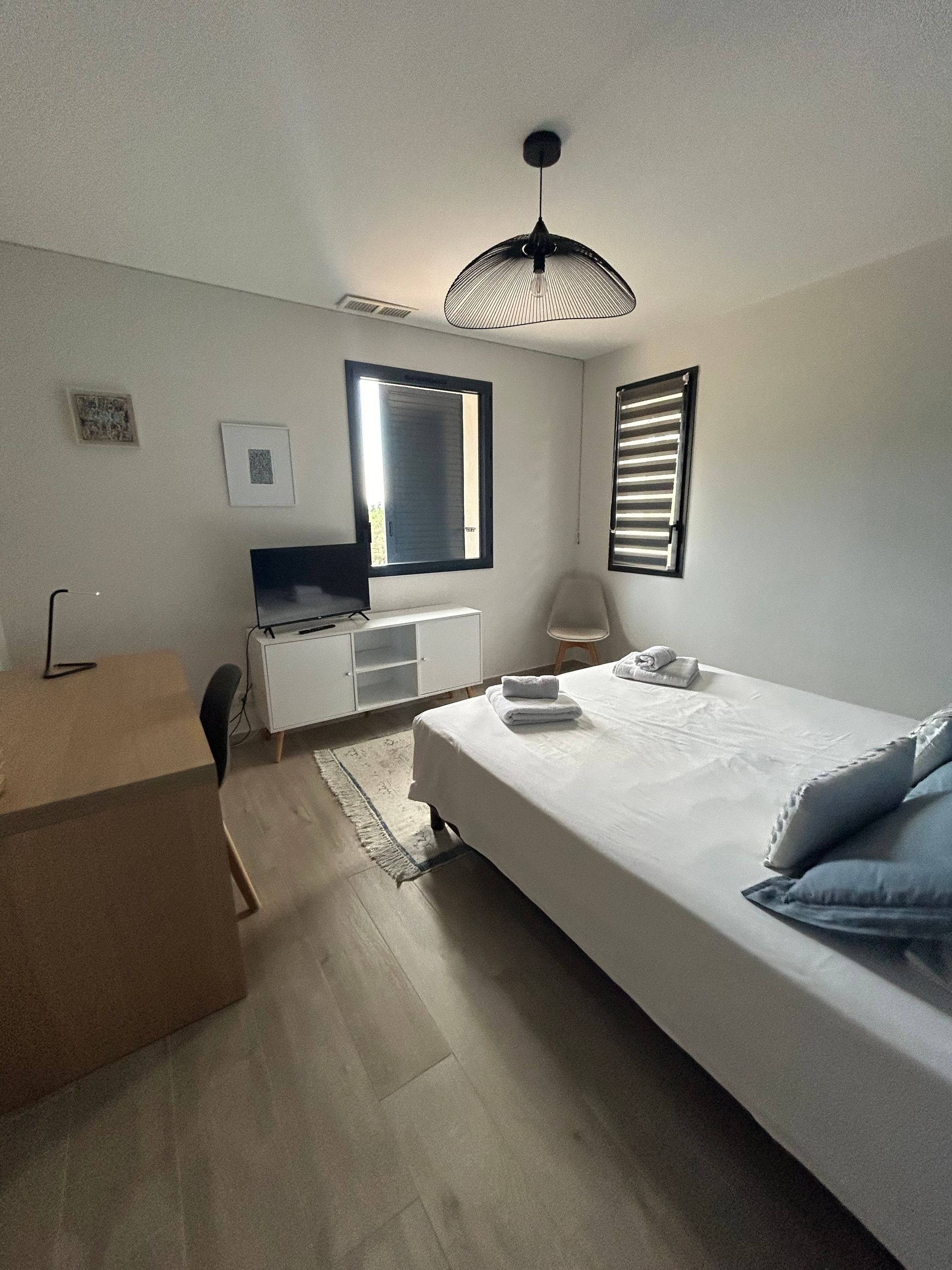 Il y a une grande master avec douche, baignoire, double vasque, dressing et toilettes au rez-de-chaussée, et 4 chambres à l’étage dont 2 qui se partagent une salle de bain.